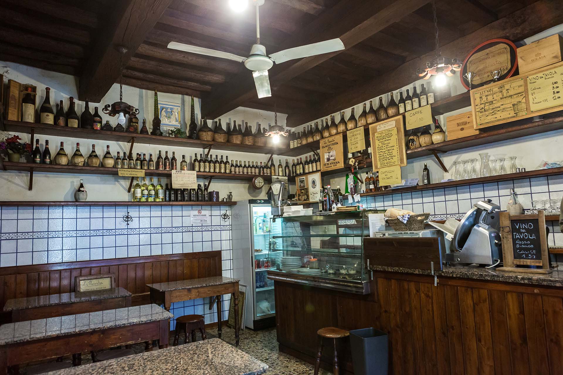Every day, La Mescita offers a different menu that includes a few dishes made with fresh products purchased at the market by the owner Alessio Bravi, who is the spokesman of an ancient tradition.Situated on the road that joins the market of San Lorenzo with the market of Sant’Ambrogio, which until the ‘50s was frequented by gardeners, farmers, and carters, the shop was founded around 1927 as a place to welcome workers from the two main markets. Initially dedicated to the serving and retailing of wine, oil, and liqueurs, during its more than ninety years of business, the restaurant has maintained its peculiarities, specialising, since the ‘70s, in catering, becoming first a tavern and then a trattoria faithful to the Florentine tradition. The interior furnishings: characterised by a long bench with a wooden backrest leaning against a wall covered in majolica and small tables with granite tops and stools, are original, while the wooden shop window enriches the street front.
